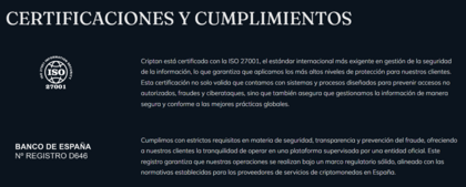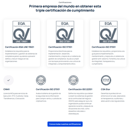 Para empezar cuenta con su registro VASP en Banco de España (nº D592), así como triple certificación Europeacon las ISO 27001, 22301, 37001, 37301 y UNE 19601 (de hecho fue el primer exchange en conseguirlo).
