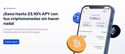 Bit2Me Earn es, hoy por hoy, la oferta de rendimiento más amplia entre los exchanges españoles: permite generar intereses con más de cuarenta criptomonedas sin salir de la plataforma, con un abanico desde recompensas conservadoras (USDC 6,5% APY, BTC 0,5% APY) hasta rentabilidades de dos dígitos en DOT, ATOM y otras altcoins, con liquidación diaria y sin comisiones de apertura ni retirada.