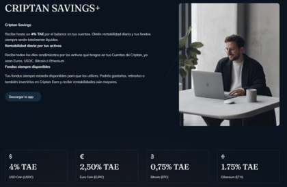 Por un lado, Criptan tiene un apartado concreto, llamado Savings+, que actúa como una cuenta remunerada diaria (USDC al 4% TAE, EUR al 2,5%, BTC al 0,75% y ETH al 1,75%), la cual puede configurarse para que todo depósito se reingrese automáticamente en Savings+ (para seguir generando de inmediato, buscando el efecto del interés compuesto). Sin necesidad de bloquear los activos y con la posibilidad de transferirlos o invertirlos en Earn en cualquier momento.