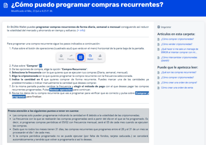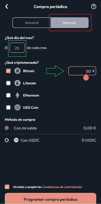Además, Bit2Me te permite programar compras recurrentesdiarias, semanales o mensuales directamente desde la app.