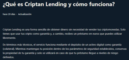 Criptan Lending sigue un modelo semejante, aunque el importe final y los costes (tasa de interés + comisión de apertura) se calculan caso a caso dentro de la app. Si el valor de la garantía cae por debajo del umbral de seguridad, Criptan te avisa para añadir colateral. Si no lo haces, se liquida la posición y se te devuelve el excedente.
