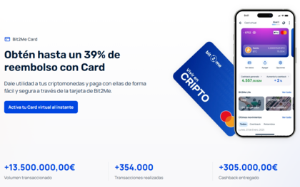 Bit2Me combina dos vías. Por un lado, la Bit2Me Card (Mastercard física o virtual, compatible con Apple/Google Pay y cashback de hasta 7% según el nivel del usuario en el Space Center) ¿Qué es Bit2Me Card?