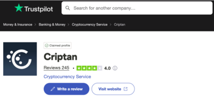 Si nos vamos a Trustpilot, la web de reviews de empresas por excelencia, vemos que la valoración media de Criptan es muy buena, con una media de 4 sobre 5 estrellas: