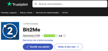En cuanto a Bit2Me, vemos también buenas puntuaciones en general, con una media de valoración de 3,8 sobre 5 estrellas en Trustpilot: