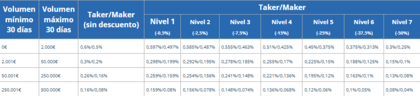 A continuación te dejo con el porcentaje de comisiones por nivel de volumen de trading mensual (para los cuatro primeros tramos):
