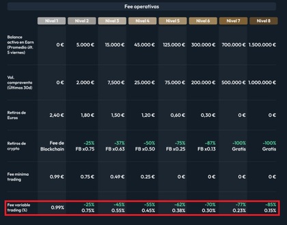 Criptan, por su parte,presenta un sistema de 8 niveles de comisiones, que combina el saldo medio en Earn y el volumen de trading del usuario: del 0,99% (Nivel 1) al 0,15% (Nivel 8), con retiros que pasan de 2,40€ a 0€, y el fee de retiros por Blockchain subvencionado hasta el 100% en los niveles superiores.