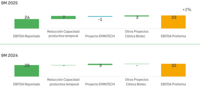 Si aislamos estos elementos no recurrentes y analizamos el EBITDA Proforma, el resultado ofrece una visión más fiel de la evolución del negocio. El EBITDA Proforma se sitúa en 33 millones de euros, un 2% superior al de los primeros nueve meses de 2024 en perímetro comparable. Esto refleja la solidez estructural de la compañía y el buen comportamiento de las áreas estratégicas que estamos impulsando.