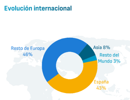 A cierre de 2024, los ingresos generados fuera de España representaron el 59% del total, frente al 55% del año anterior, impulsados principalmente por la fortaleza de los mercados europeos (+13%). La distribución geográfica del negocio se mantiene prácticamente estable en los primeros nueve meses de 2025: el 41% de las ventas se generan en España, el 48% en el resto de Europa y el 11% en mercados internacionales, con Asia representando un 7%.