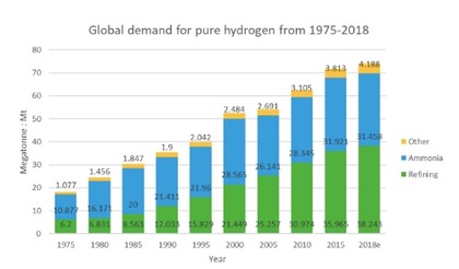Es, por lo tanto, una alternativa limpia al gas natural y al metano. Además, es el elemento químico más abundante; se estima que aporta el 75% de la masa del universo. En la Tierra, el agua, las plantas, los animales y, por supuesto, los seres humanos, contienen una gran cantidad de átomos de hidrógeno. Aunque, si bien está presente en casi todas las moléculas de los seres vivos, es muy escaso como gas: menos de una parte por millón en volumen. Demanda global de hidrógeno 1975 - 2018 | Fuente: CSEG Recorder.