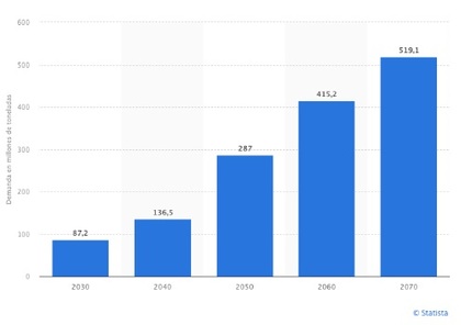 Demanda mundial estimada de hidrógeno verde 2030-2070 | Fuente: Statista.