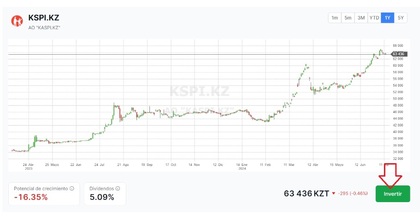 Por último, y una vez estudiada y meditada nuestra decisión, será tan sencillo como acceder al activo en concreto (es decir, a las acciones de Kaspi), y empezar a configurar la orden de comprar. Para ello, hacemos click sobre el botón “Invertir”