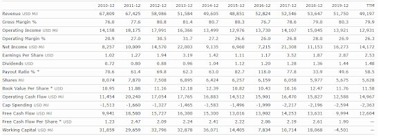 Los dividendos son ascendentes con un Pay out (parte de los beneficios que la empresa paga al accionista) controlado sobre todo en estos últimos años, ya que está destinando más efectivo a hacer adquisiciones. Las acciones en circulación son cada vez menos, es decir nuestro trozo de la empresa como accionistas es cada vez mayor.