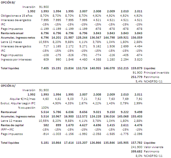 A/ Comprar la vivienda como inversión inmobiliaria y proceder a su arrendamiento posterior. Se alquiló la vivienda en enero de 1.993 a 4,6€/m2/mes, siendo la renta percibida neta anual de 5.514€. Esta renta durante los 19 años fue evolucionando conforme el IPC general. El inquilino atendió el pago del IBI, la comunidad, y todos los gastos por reparaciones y mantenimiento.