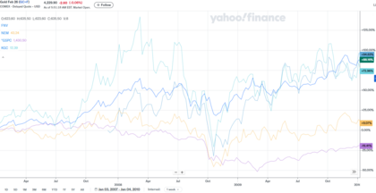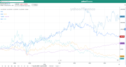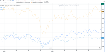 Al pie evolución de oro, SP500, Franco Nevada, Kinross y NewMont desde 2.007 a 2.125
