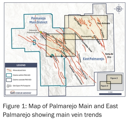 Coeur presenta resultados de campaña de taladros realizados en su concesión Palmarejo-Este, adquirida a Fresnillo en 2.024, que son prometedores ya que confirman la existencia de "corredores" hasta ahora desconocidos, con leyes de Au-Ag "bonanza grade", y, fundamentalmente, libres del Royalties de Franco Nevada, x la que Coeur se obliga a vender un elevado % del Au producido en Palmarejo-Oeste a Franco Nevada a $ 800 oz.