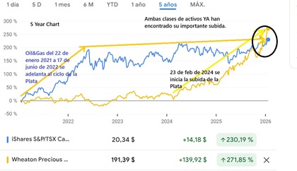 Te pongo un gráfico, que tiene como proxi un ETF de Oil&Gas canadiense, y WPM como proxi de la Plata. Como observarás, la subida de Oil&Gas ya aconteció hace años atras; mientras que la Plata lo ha hecho más recientemente feb 2024. Ahora se encuentran un poco a la par. Por lo tanto, yo ya no estoy comprando barato la Energía, pero lo estoy pagando con ganacias de WPM. Ello tan solo me da la oportunidad de diversificar la cartera de inversión, que es lo que deseo (ya que no llevo Energía), y por otro lado no estoy tan expuesto a WPM cuyo peso en cartera sobrepasa el porcentaje máximo dispuesto a asumir en una única empresa. Como verás, cada inversor tiene sus propias circunstancias para actuar en los mercados de determinadas formas. He vendido WPM para comprar un ETF de minerales y otro de Energía. Ahora mi cartera de Real Assets está más completa de cara a futuro.