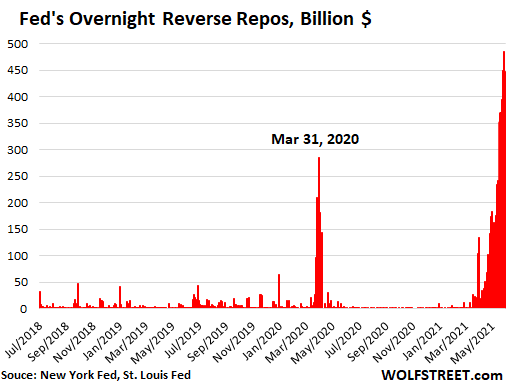 Las compras de activos de la Fed ya han creado tanta liquidez, lo que ha hecho que las reservas bancarias se dupliquen en un año a $ 3.8 billones, esa liquidez ahora se está volviendo loca y la Fed está febrilmente comprometida tratando de controlarla vendiendo valores del Tesoro y por efectivo a través de repos inversos a un día, drenando así liquidez del mercado.