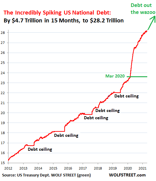 Así que esta es la Deuda Nacional de EE. UU. Increíblemente en aumento, ahora en $ 28,2 billones, de los cuales la Fed ha comprado $ 5,1 billones, más de la mitad desde marzo de 2020: