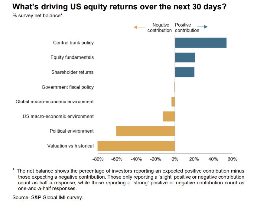 ¿Qué impulsa los mercados?: La última encuesta del Indice de Gestores mostró un fuerte cambio de rumbo hacia el optimismo desde el pesimismo previo, y esto es lo que piensan sobre lo que impulsa las perspectivas. Básicamente, se trata de que sí, nos preocupan las altas valoraciones y el caos político, pero las ganancias siguen siendo decentes y, lo que es más importante, la Reserva Federal está flexibilizando su política monetaria (sin ninguna recesión/crisis), así que es cuestión de mantener la calma y seguir adelante con el optimismo.