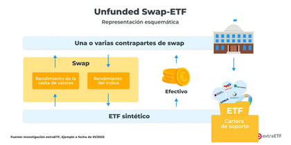 En este tipo de réplica, el emisor del ETF entrega a la contraparte el dinero que recibe al crear nuevas participaciones. A cambio, la contraparte se compromete a devolver el rendimiento del índice, antes de descontar comisiones y costos. Además, la contraparte deja un colateral(garantía) con un custodio independiente, para proteger al emisor del ETF. Este colateral puede incluir distintos tipos de activos.
