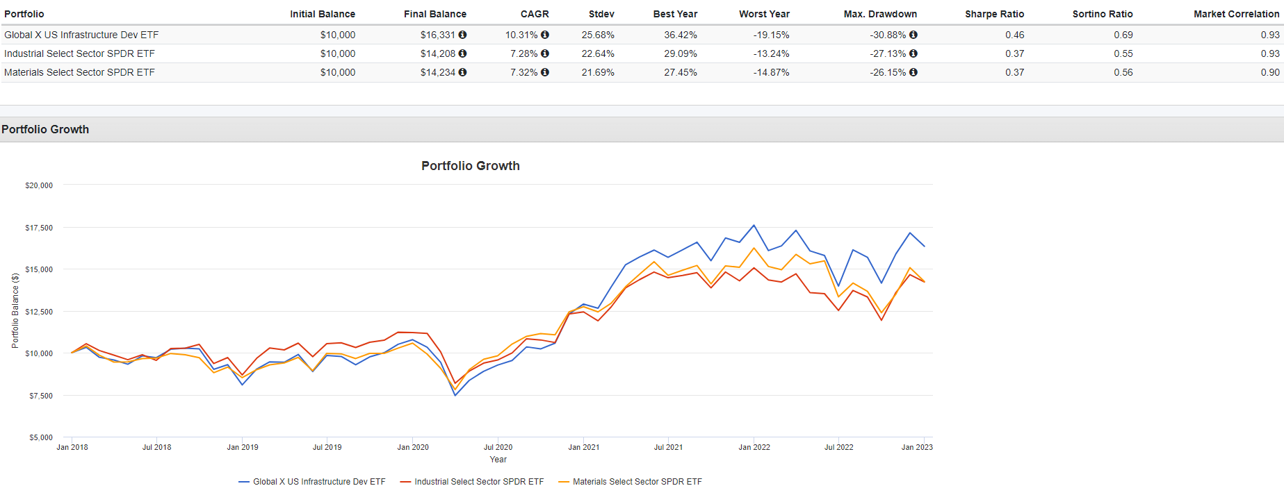 Ya que poco más del 90% de la exposición la tiene en el sector industrial y de materiales, entonces vale la pena comparar el desempeño de este ETF PAVE con el de dichos sectores.