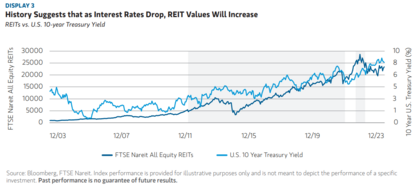 Históricamente, los valores de los REITs tienden a aumentar cuando las tasas de interés bajan. Esta relación negativa entre las tasas de interés y el rendimiento de los REITs se basa en datos históricos que muestran cómo los REITs suelen beneficiarse de un entorno de tasas de interés en descenso. En la gráfica, se observa la comparación entre el índice FTSE Nareit All Equity REITs y el rendimiento de los bonos del Tesoro de EE. UU. a 10 años. A medida que las tasas de los bonos caen, el valor del índice de REITs tiende a subir, lo que respalda la idea de que los REITs son una opción atractiva en periodos de políticas monetarias de relajación.