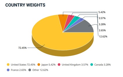 Aunque se define como un índice global, el MSCI World está altamente concentrado en Estados Unidos, que supera el 70 % del peso total. Le siguen Japón, Reino Unido, Francia y Canadá, con participaciones mucho menores.