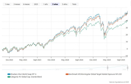 Con una comisión muy competitiva del 0,12 % anual (TER) y un patrimonio gestionado de unos 6.488 millones de euros, se presenta como una opción fiable y eficiente para conseguir exposición global a la renta variable.