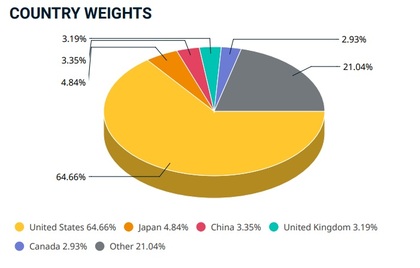 El MSCI ACWI tiene una fuerte concentración en los mercados desarrollados, que representan cerca del 90 % del índice, con Estados Unidos como claro dominante (más del 60 % del total). Le siguen Japón, el Reino Unido, Francia y Canadá, con pesos más moderados.