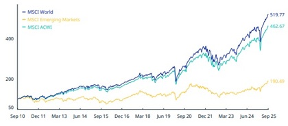 Si lo que buscas es simplicidad, estabilidad y una exposición sólida a las grandes economías del mundo, el MSCI World suele ser la mejor opción. Su rendimiento histórico ha sido ligeramente superior gracias al peso dominante de Estados Unidos, que ha impulsado gran parte del crecimiento global en la última década. Además, al no incluir mercados emergentes, evita parte de la volatilidad que estos aportan.