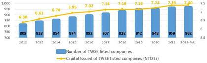 Evolución del número de compañías listada y capital en la Bolsa de Taiwán