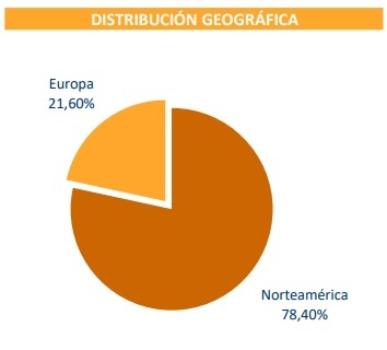 La cartera está concentrada principalmente en Norteamérica (78,40%), mientras que Europa (21,60%) representa el resto de la exposición, lo que refleja un sesgo claro hacia compañías estadounidenses.