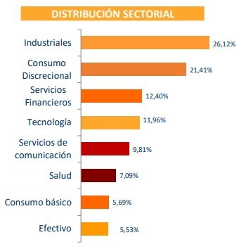 El fondo mantiene una cartera ampliamente diversificada por sectores, con mayor peso en Industriales (26,12%) y Consumo Discrecional (21,41%), seguido de Tecnología (11,96%) y Servicios Financieros (12,40%).