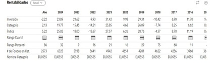 Es interesante estudiar el comportamiento de un fondo en diferentes periodos. Por un lado, podemos ver las rentabilidades que ha tenido en distintos años naturales y, por otro, la rentabilidad anualizada a 3, 5 o 10 años, por ejemplo.