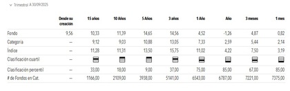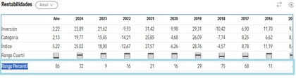 El fondo tiene muy buenos percentiles en varios periodos (9, 11, 16, 21…), lo que indica que suele situarse entre los mejores de su categoría, aunque en algún periodo concreto (75, 68, 86) lo ha hecho peor.