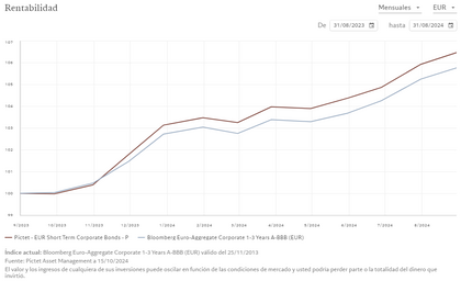 En mi opinión, el fondo Pictet - EUR Short Term Corporate Bonds ser una buena alternativa al efectivo o a los fondos monetarios, ya que ofrece una rentabilidad superior (con una TIR del 3,91%) sin asumir riesgos significativamente mayores.