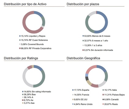 Distribución de la cartera del fondo - Fuente: ficha del fondo Por plazos, el mensaje es inequívoco: más del 86% vence en menos de un año (53,6% a <6 meses y 32,6% entre 6–12 meses), con apenas un 13,3% entre 1–3 años. Resultado: sensibilidad a tipos contenida y drawdowns mínimos… con el peaje de riesgo de reinversión si el BCE empieza a recortar.