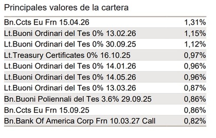 ¿Qué lleva en las primeras posiciones? Bonos muy cortos y muy líquidos: varias líneas del Tesoro italiano al 0%, bonos/letras de España, un US Treasury 0% (10/2025), un BTP 3,6% (09/2025) y un bono flotante de Bank of America con call en 03/2027. Cada uno pesa ~0,8–1,3%.
