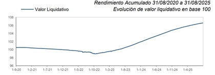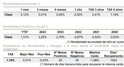 La curva de resultados del fondo se lee como un termómetro del precio del dinero: suma +0,12% en 1 mes, +0,41% en 3 meses, +0,92% en 6 meses y +2,30% a 12 meses, una pendiente suave y constante propia de un monetario que va pegado al tipo a corto.