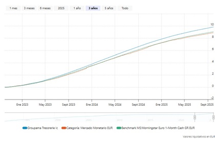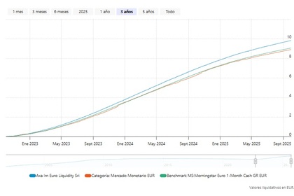 Desempeño del fondo en 3 años La línea de rentabilidad es la típica de un monetario bien llevado: suave y ascendente cuando los tipos están altos, moderándose a medida que el BCE recorte y la cartera se reinvierta. Además, añade un filtro SRI/ESG sin complicar el riesgo: duración 0–0,5, crédito grado de inversión, tamaño grande y liquidez holgada.