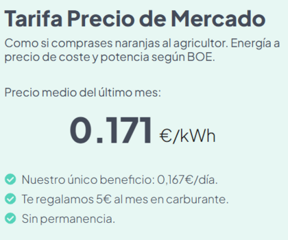 Es una tarifa indexada al precio real del mercado mayorista, con discriminación horaria. El precio de la luz varía cada hora y se suma una pequeña cuota de gestión mensual. Permite aprovechar los momentos en que la luz es más barata hoy, pero requiere estar atento a la evolución de los precios diarios.