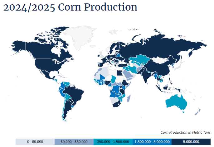 La producción mundial de este cereal ha crecido de forma constante en las últimas décadas, situándose actualmente por encima de los 1.000 millones de toneladas métricas, según indican los datos del Departamento de Agricultura de EE.UU. (USDA por sus siglas en inglés) para el año 2024. Entre los principales países productores de maíz tenemos a Estados Unidos (31% del total), China (24%) y Brasil (11%).