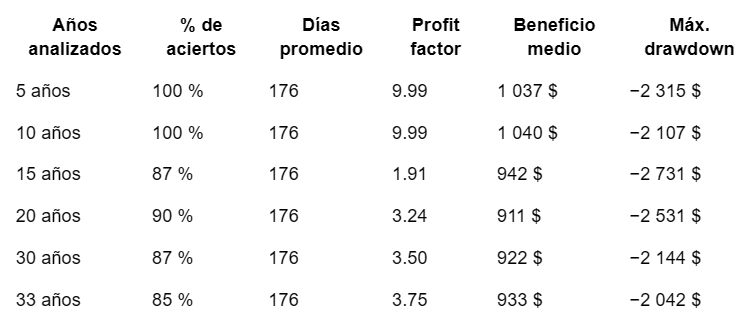 Durante los últimos 33 años, esta estrategia ha mostrado un comportamiento consistente, con ratios de acierto superiores al 85 % y una rentabilidad media estable en distintos marcos temporales. Los resultados estadísticos se resumen en la siguiente tabla: