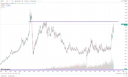 El precio del platino se rige, como cualquier otro activo, por las fuerzas de la oferta y la demanda. Sin embargo, podrás apreciar que solo en 2025 se ha revalorizado en torno a un 100%, ubicándose ya en su tercer gran máximo histórico, y muy cerca de batir el pico de 2011
