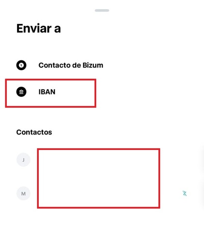 Simplemente selecciona la forma que más te acomode. En mi caso, como es una transferencia que me haré a mi cuenta del banco personal, escogeré la opción "IBAN". Y por cierto, si no es la primera vez que vas a realizar esa transferencia, y ya tienes la cuenta bancaria o Bizum registrado, te aparecerá directamente abajo (cuadro rojo relleno de blanco)