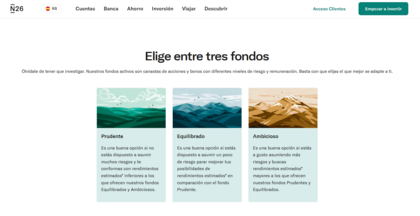 N26 también permite invertir en Fondos Activos, compuestos por cestas diversificadas de acciones y bonos que se adaptan al nivel de riesgo de cada usuario. Existen tres perfiles disponibles: Prudente, Equilibrado y Ambicioso, según el grado de exposición que quieras asumir.
