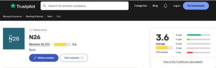 Veamos a continuación la opinión general de los usuarios acerca de N26. Si consultamos Trustpilot, la web de reseñas de apps y servicios por excelencia, vemos que la puntuación es buena, aunque no excelente: 3,6 sobre 5 estrellas: