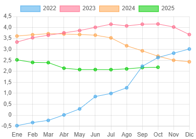 El euríbor en noviembre 2025 oscila en torno al 2.200% tras las respectivas bajadas desde principios de enero y el leve aumento durante el mes de octubre.