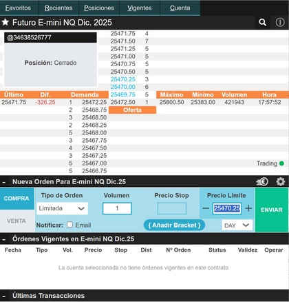 Por ejemplo, si vas largo en el contrato de diciembre (NQZ25), lo cierras y abres una posición larga en el de marzo (NQM26). Si estás corto, puedes hacer lo mismo pero en sentido inverso.