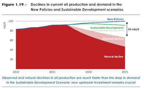Por último, esta imagen pertenece al informe anual de la AIE en 2018. Avisa de lo que ocurriría con la producción de petróleo (hasta 2040) si cesaran completamente las inversiones. Habría que actualizar la producción de los últimos años, donde la producción ha seguido aumentando por la inversión en años precedentes, pero la caída seguiría siendo la misma si dejamos de invertir, como proponen los estamentos oficiales.